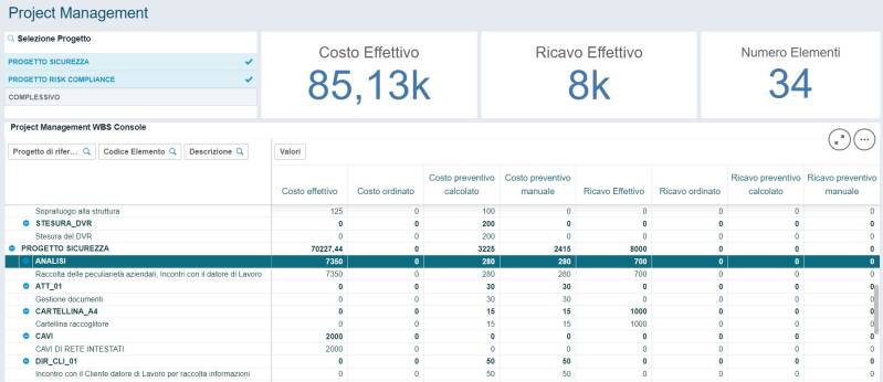 Console di controllo di gestione dei progetti aziendali per la valutazione degli stati di avanzamento delle attività e dei costi/ricavi effettivi e preventivi presenti in WBS