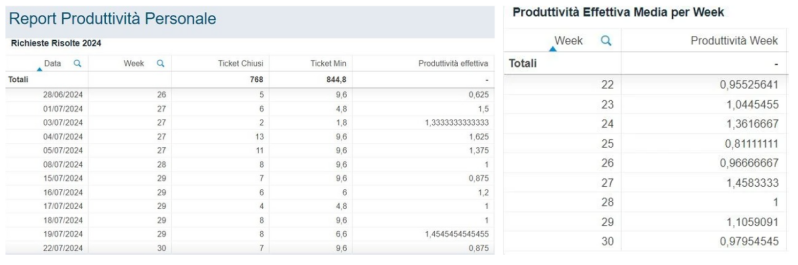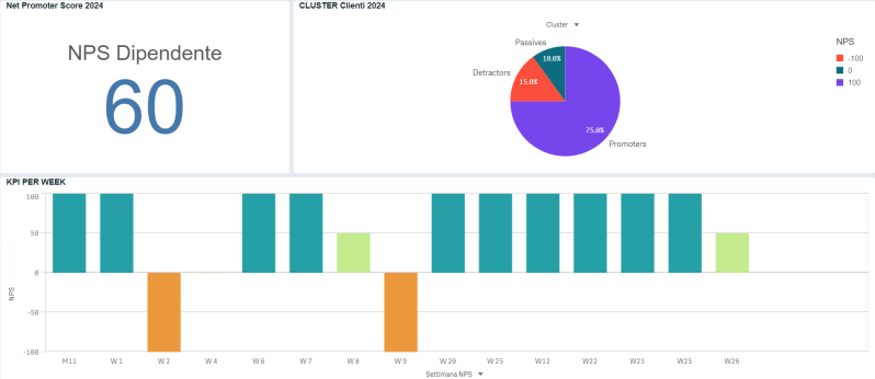 Dashboard di analisi organizzativa per la valutazione della produttività nel settore dei servizi e del raggiungimento dei target personali definiti, ivi incluso il Net Promoter Score indicativo della soddisfazione del cliente